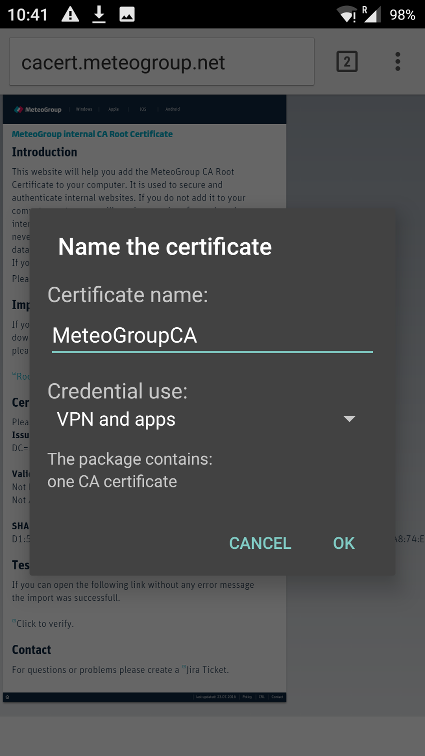Enter a name for the certificate. I choosed "MeteoGroupCA" in this example. Choose "VPN and Apps" from the listbox. Finally select "OK".