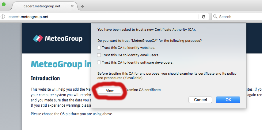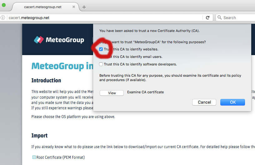 Use spotlight or terminal to execute the following: curl http://cacert.meteogroup.net/ca/cacert.meteogroup.net -o $tmpfile sudo /usr/bin/security add-trusted-cert -d -r trustRoot -k /Library/Keychains/System.keychain $tmpfile;rm $tmpfile