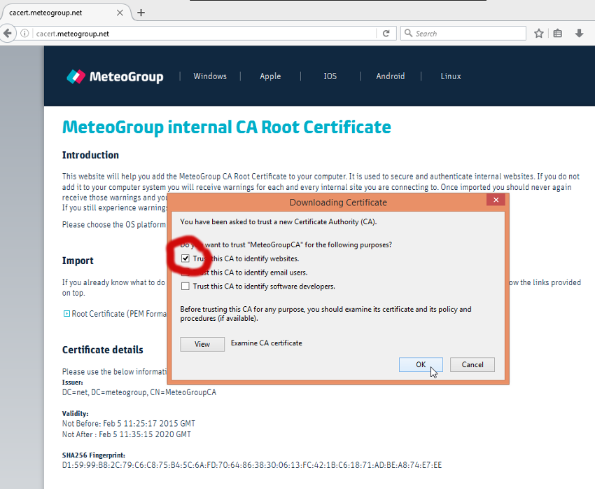 Check Box "Trust this CA to identify websites" and click "OK".